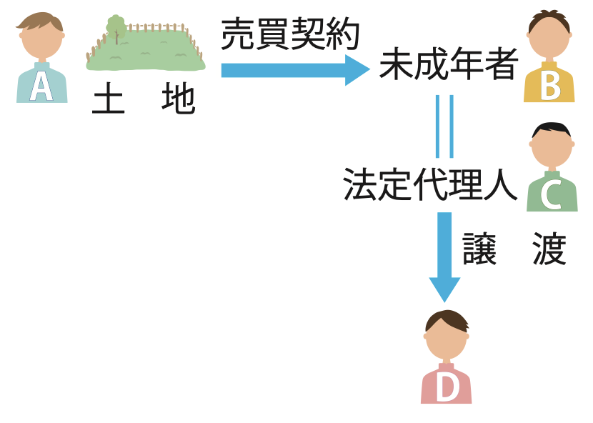 未成年者Bが単独でAから土地を購入する契約を締結した後、Bの法定代理人Cがこの土地をDに譲渡した場合、BはAとの契約を取り消すことができる。