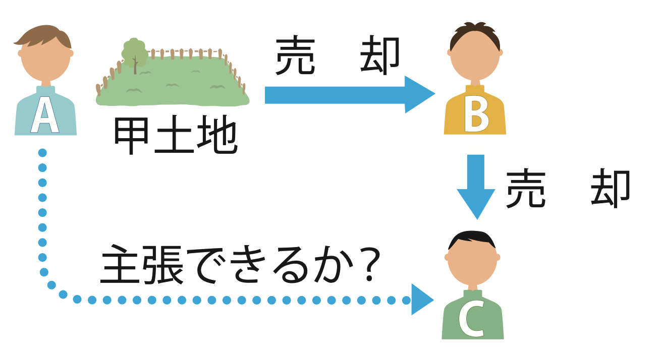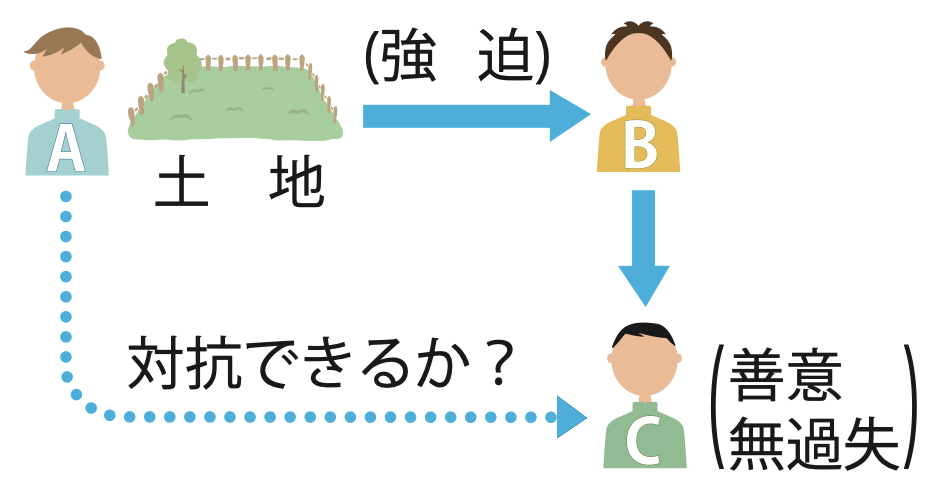 A所有の土地が、AからB、BからCへと売り渡された。AがBに強迫されて契約したのであれば、AはBとの契約を取り消すことはできるが、そのことを善意無過失のCに対抗することはできない。